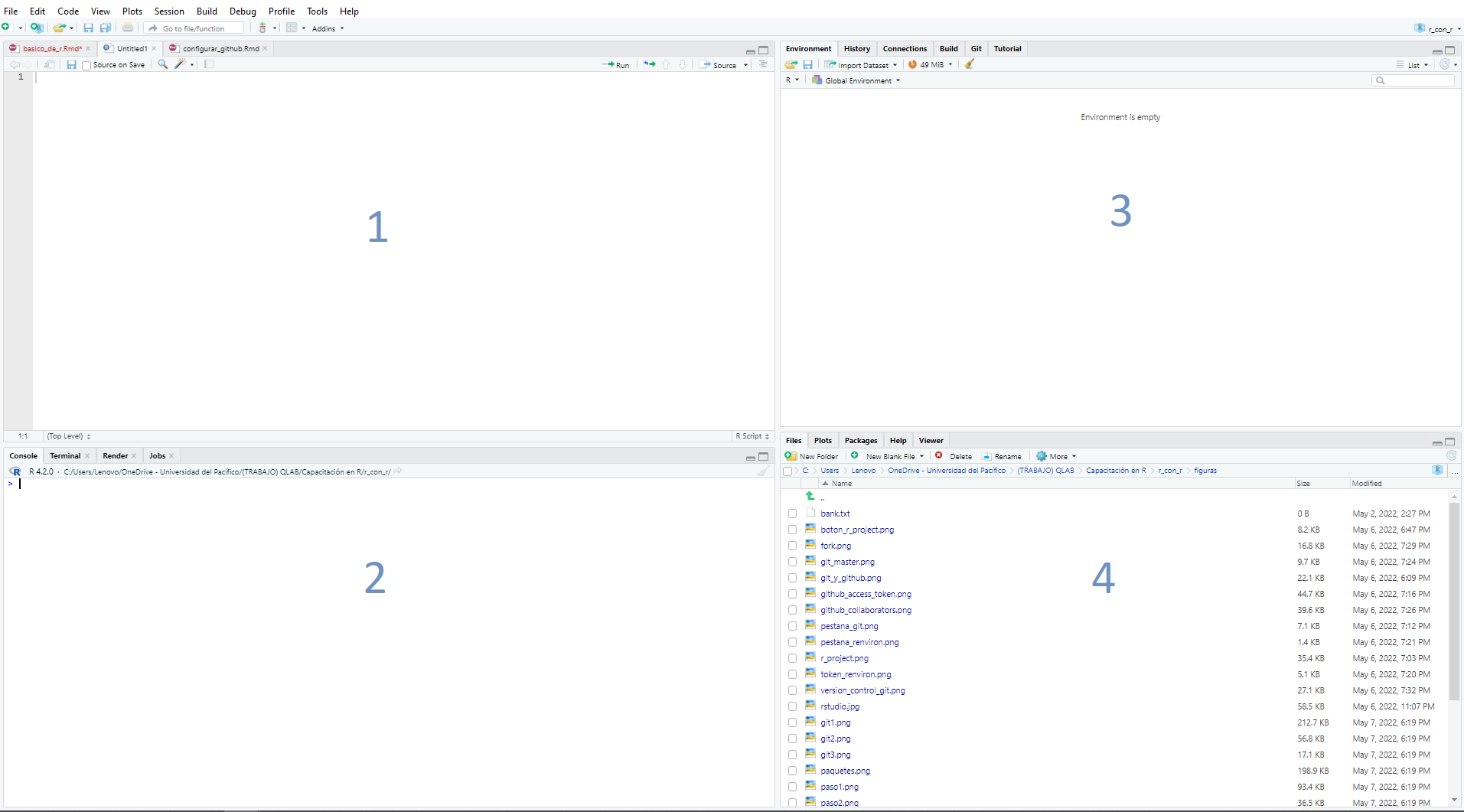 De manera previa, resulta importante familiarizarse con el entorno gráfico de RStudio lo cual se puede observar en la siguiente imagen: