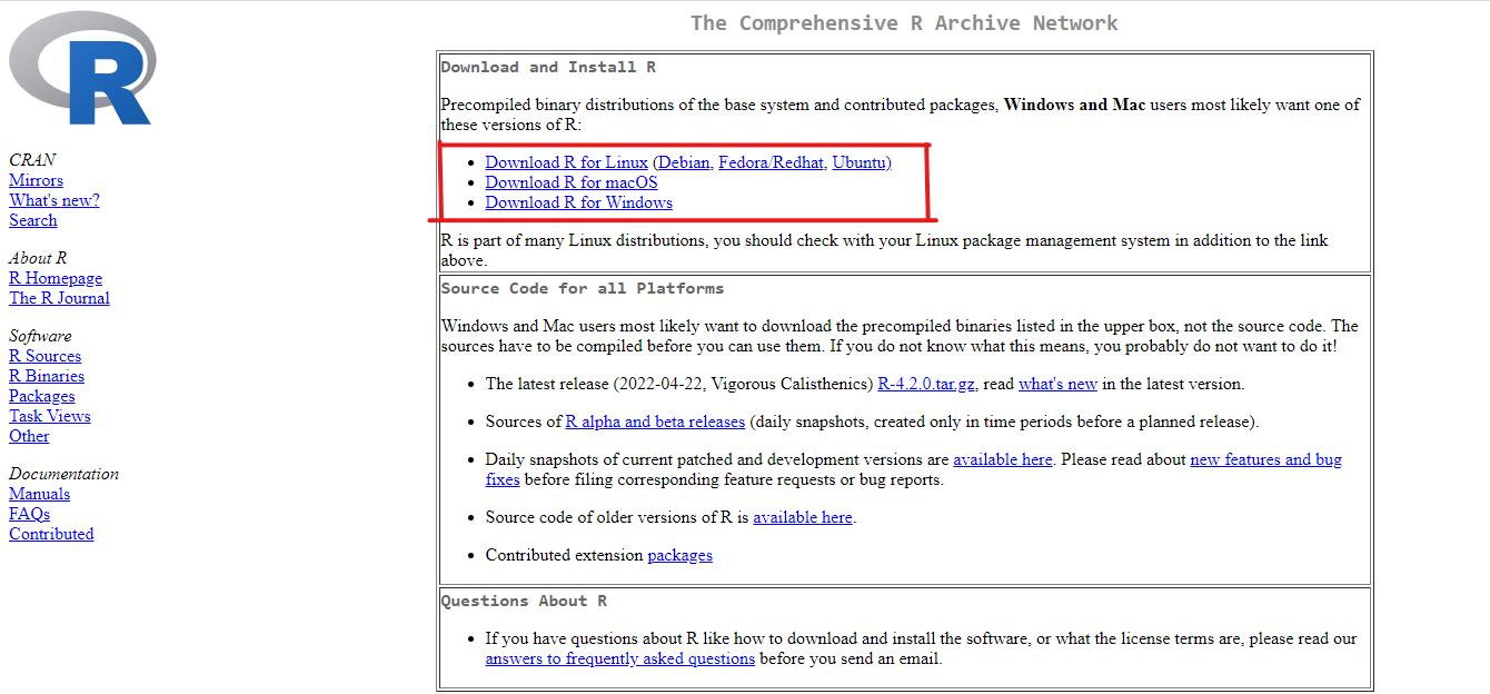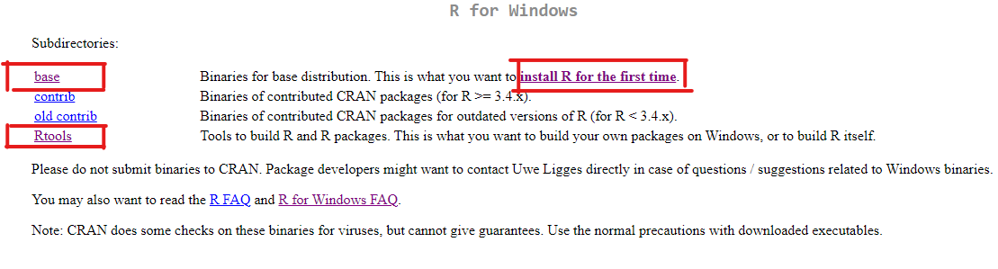 Paso 3 : Haces click en “Install R fot the first time” si es la primera vez que bajas R, en “base” si ya haz descargado antes R y quieres la nueva versión. Una vez descargados regresaremos a esta pagina y haremos click en “R-tools”(Más adelante se especificaran los pasos.)