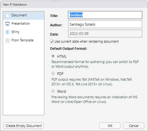 Si le damos “OK” a la creación del RMarkdown nos creará un YAML header con los aspectos básicos necesarios para generar un HTML output: